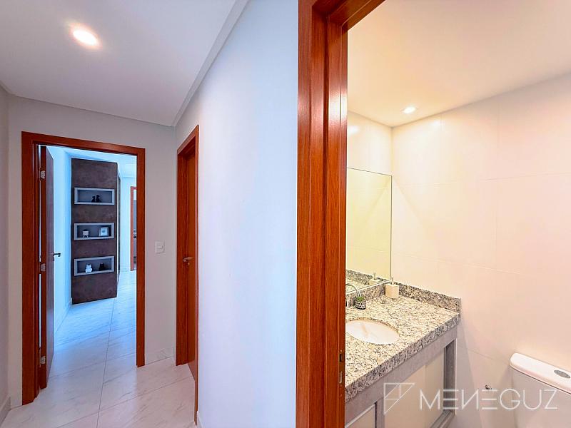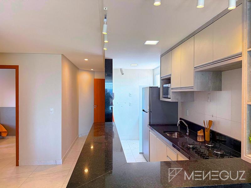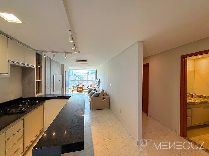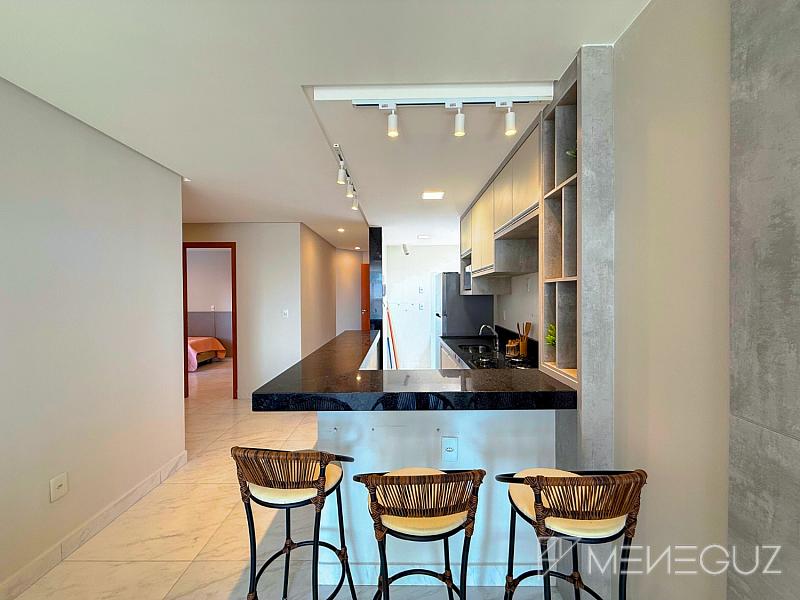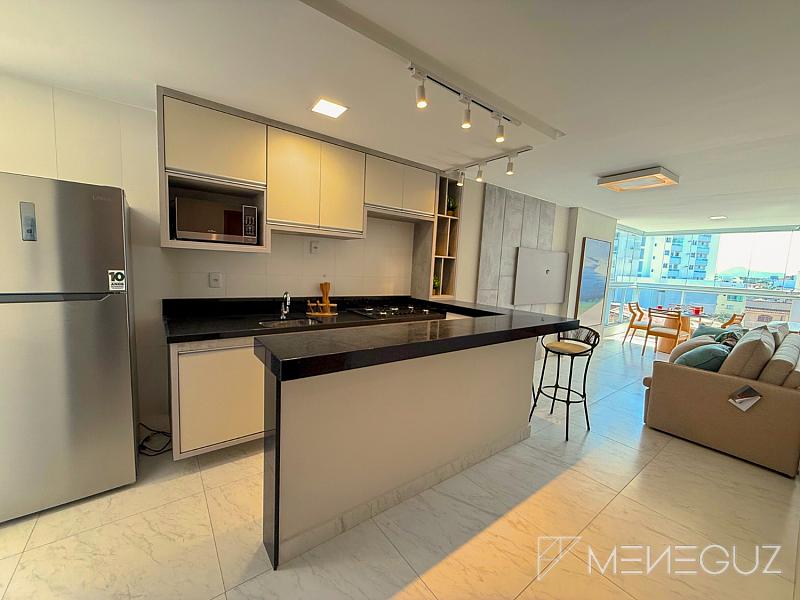 • Cozinha americana integrada à sala, com acabamento de alto padrão