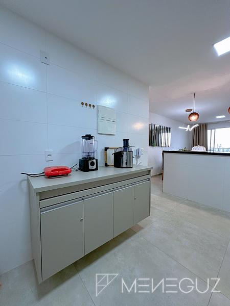 • Cozinha moderna com armários planejados e conectada à área de serviço.