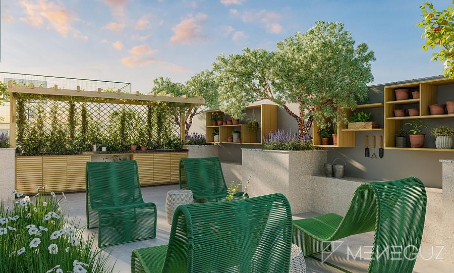 *Viveiro de mudas: Projetado por paisagista com larga experiência em hortas urbanas, o viveiro tem, como em toda área da horta, posicionamento e insolação planejados e capacidade para atender à reposição de mudas da horta em pleno uso pelos moradores. A irrigação será por um sistema de