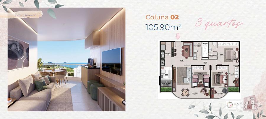 • Coluna 02: 105,90 m² | 3 quartos (1 suíte) | 2 vagas