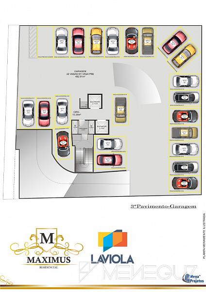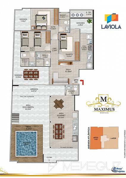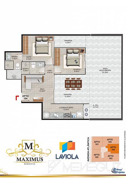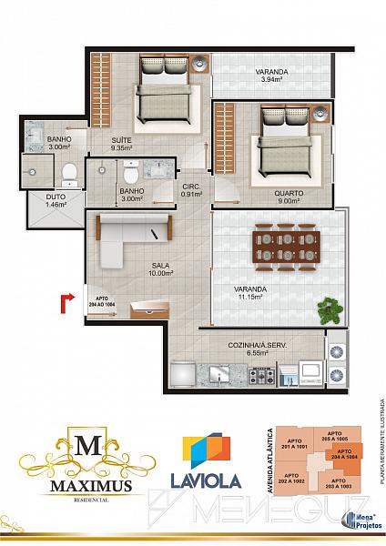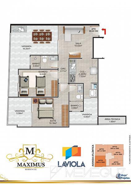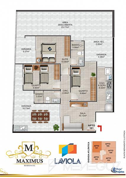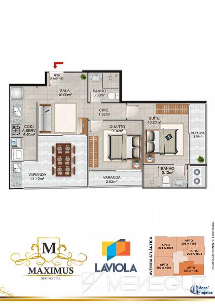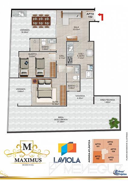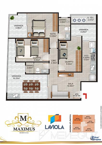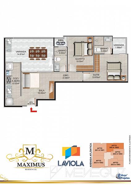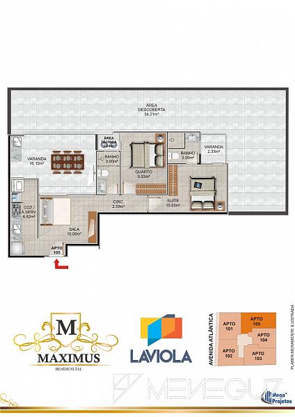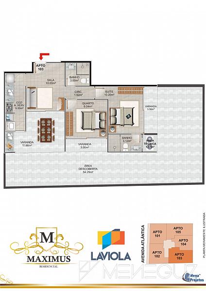 Coluna 01: Apto 3 quartos, sendo 1 suíte, cozinha, sala de jantar/ estar, com varanda, com duas vagas de garagem.
