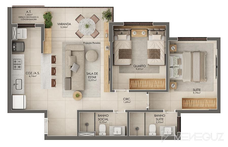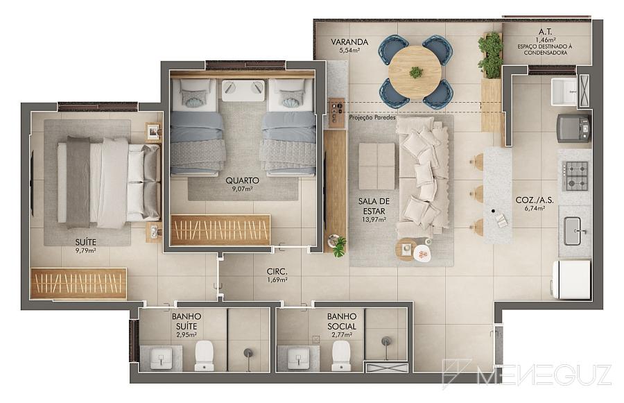 • Plantas inteligentes que privilegiam luz natural, ventilação e integração dos ambientes