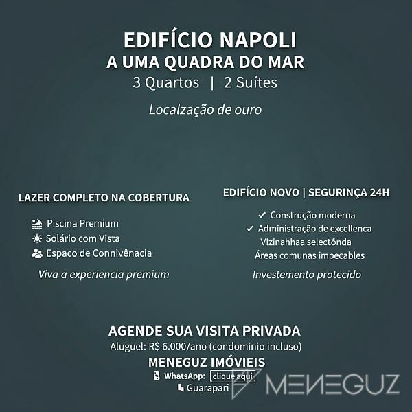Edifício Napoli — Modernidade, conforto e localização estratégica. 3 quartos com 2 suítes, lazer completo na cobertura, a apenas uma quadra do mar. Aluguel anual R$ 6.000 (condomínio incluso).