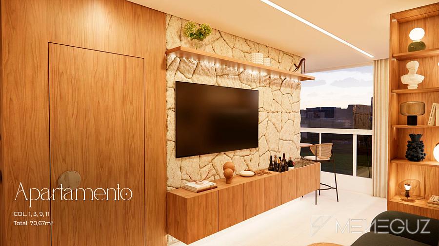 • 2 Quartos (68m²) Para famílias que exigem conforto total. Dois suítes, sala em dois ambientes, varanda com churrasqueira e vista panorâmica da Praia do Morro.