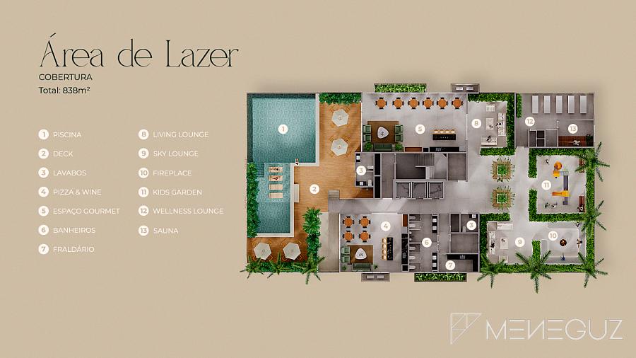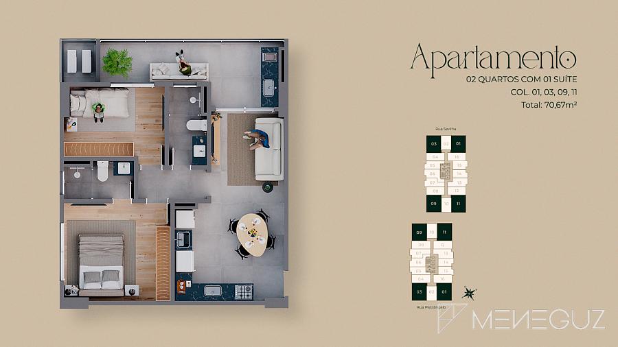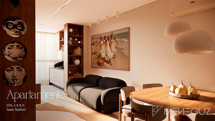 2 Quartos (68m²) Para famílias que exigem conforto total. Dois suítes, sala em dois ambientes, varanda com churrasqueira e vista panorâmica da Praia do Morro.