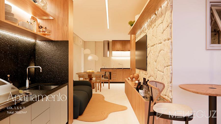 1 Quarto e Sala (48m²) O equilíbrio perfeito entre espaço e funcionalidade. Sala ampla integrada à varanda gourmet, quarto suite com closet planejado e vista parcial do oceano.