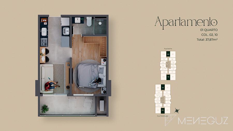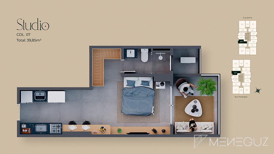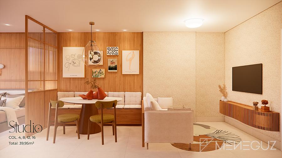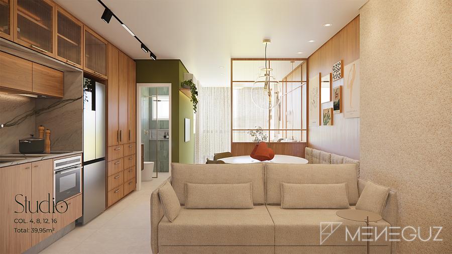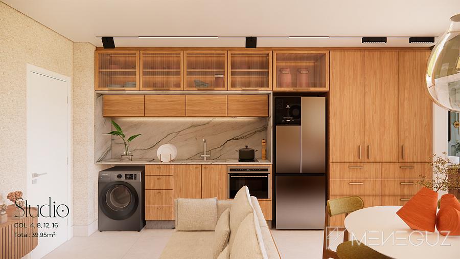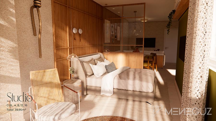 Studio Pietra (28m²) Para quem busca praticidade sem abrir mão do requinte. Perfeito para investidores ou primeira residência, com kitchenette integrada e varanda com visão do mar.