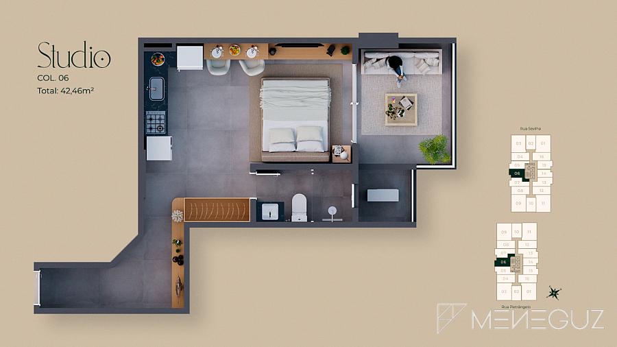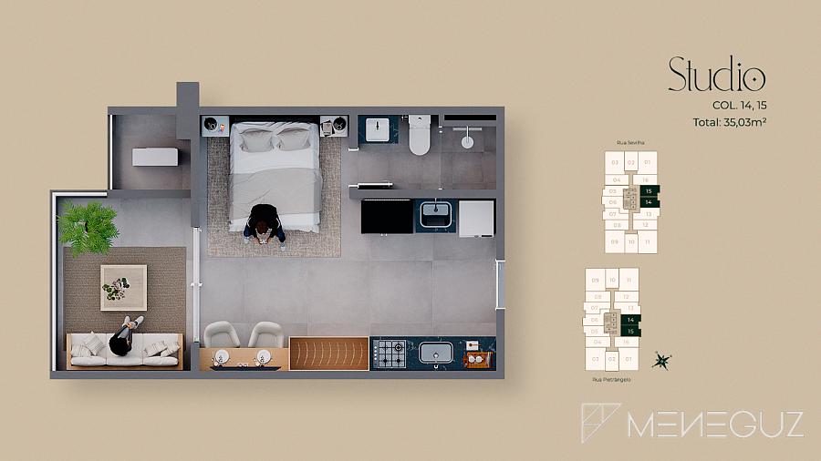 • Studio Pietra (28m²) Para quem busca praticidade sem abrir mão do requinte. Perfeito para investidores ou primeira residência, com kitchenette integrada e varanda com visão do mar.