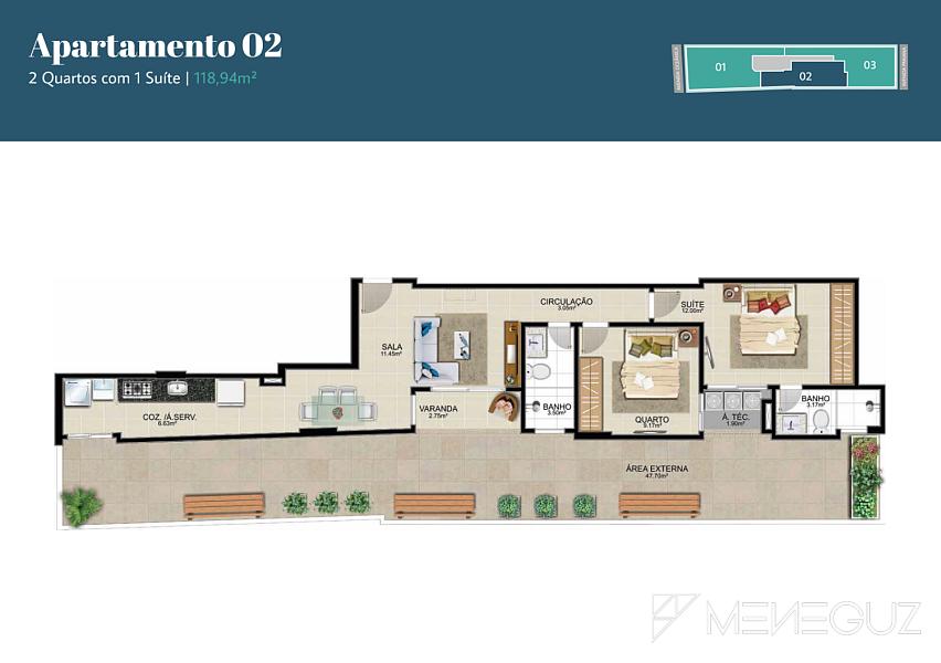 • Espaço e conforto: Com três quartos, o apartamento oferece a privacidade e o aconchego que sua família merece, com ambientes bem distribuídos e a tranquilidade de um condomínio que valoriza seu bem-estar.