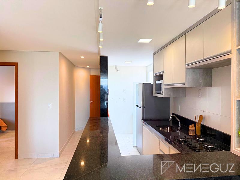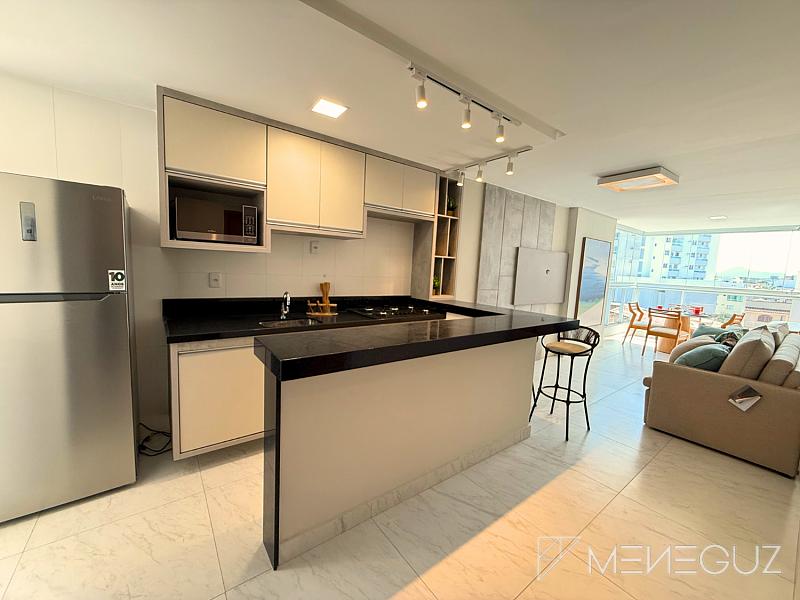 A cozinha americana equipada e os armários planejados em todos os ambientes garantem funcionalidade e elegância.